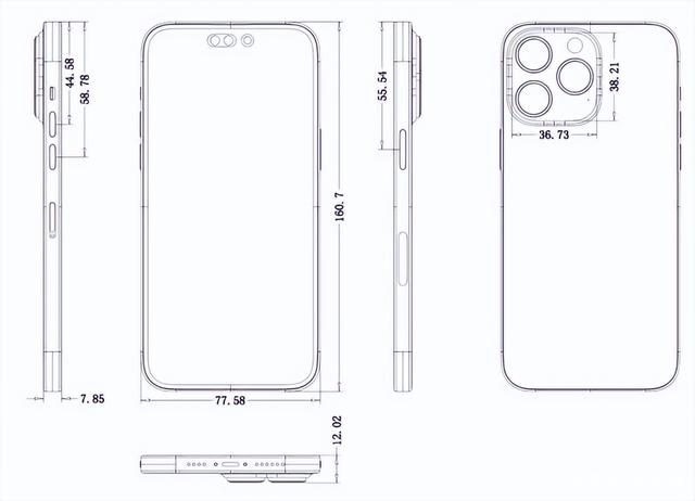 比如iPhone14ProMax的高度为160.7毫米,机身厚度为7.85毫米,相机突起厚度为4.17毫米,相机尺寸为 36.73 毫米×38.21毫米。