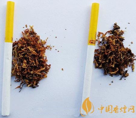 真烟烟支黄色接装纸长度为30mm,烟丝切丝宽度均匀,烟丝疏松、光泽油润性好,呈柠檬黄色,烟丝结构为叶丝和少量造纸法再造烟叶;假烟烟支黄色接装纸较长为32mm,烟丝切丝宽度不匀,光泽油润性较差,烟丝结构为叶丝和膨胀梗丝,与真品特征存在明显差异。