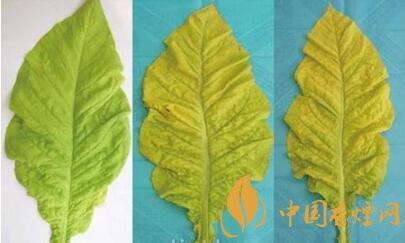 烟叶达到成熟时,叶面的绿色逐渐消退,黄色程度增加,称为“落黄”。下部烟叶落黄成熟,叶尖和叶边缘为黄色,整个叶面为绿黄色。中上部叶或比较厚的叶片成熟时,叶面为浅黄至淡黄色,有黄色至黄白色成熟斑,叶尖和叶缘为黄白色。