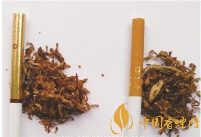 真烟烟丝切丝宽度均匀,烟丝疏松、光泽油润性好,呈柠檬黄色,烟丝结构为纯叶丝;假烟烟丝切丝宽度不匀,光泽油润性较差,烟丝结构为叶丝和少量梗丝,与真品特征存在明显差异。