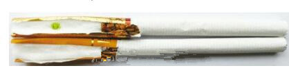 真烟烟支采用爆珠滤嘴,中间有一颗绿色的小爆珠,接装纸颜色为金黄色,长度为40mm;假烟烟支采用单一醋酸滤嘴,接装纸颜色为黄色,长度为34mm,与真品特征存在明显差异。
