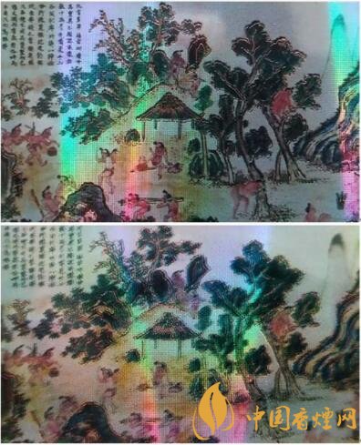 真品卷烟“采香图”图案清晰,树木烫金线明亮。商标纸底纹为点状,观察呈现网格状。该款假冒卷烟“采香图”图案模糊,树木烫金线暗淡,商标纸底纹无网格状,呈现菱形图案。