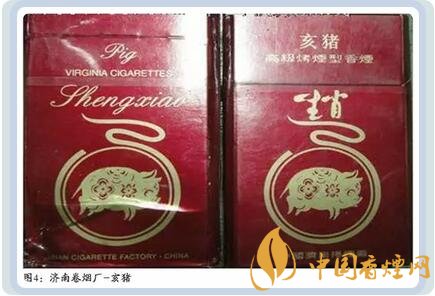 山东济南卷烟厂曾出品过采用中国民间传统的剪纸手法设计,底色为红色的 “亥猪”烟标。图案上是一头肥嘟嘟的花猪形象,其短小的四肢似乎支撑不了它的重量,两只竖立的耳朵和张开的小嘴,表明它正在寻找食物,看上去十分温驯、可爱。