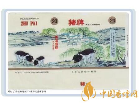 广西桂林卷烟厂生产过一款猪牌烟标,图案是三头花猪正在春风柳绿的村庄外的山地上觅食,包装上对焦油量、烟气烟碱量有明确的标识。