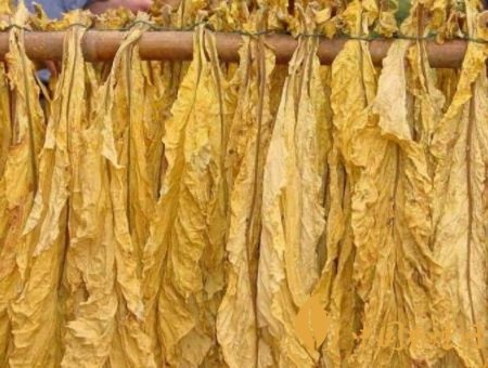 眼看:具备黄色烟叶的基本色。没有任何的含青或明显的挂灰和蒸片类杂色,没有大面积光滑,色度无异常,有些中上部叶片带有成熟斑。