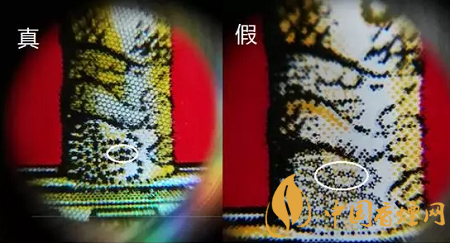 “中华”原产地标志为蓝色椭圆形,折光可见“中华”字样、8颗“★”及天安门图案。真烟色彩饱满,图案清晰;假烟色彩暗淡,图案模糊。同时还可以借助图中蓝色线的走势来区分真假烟。