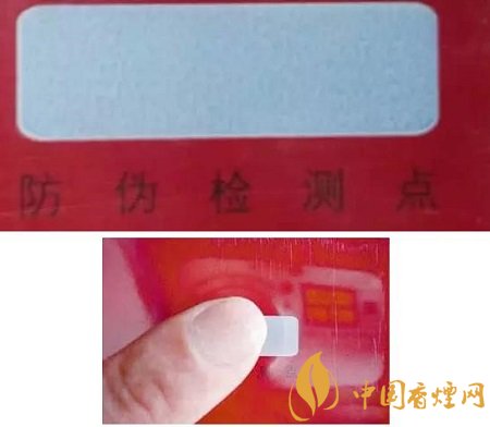 防伪检测点所采用的是热敏防伪技术,真烟用手指来回搓热防伪检测点,白色会变成深蓝色,等温度降低后又会恢复原来的白色状。假烟经摩擦发热后出现的是灰白颜色。