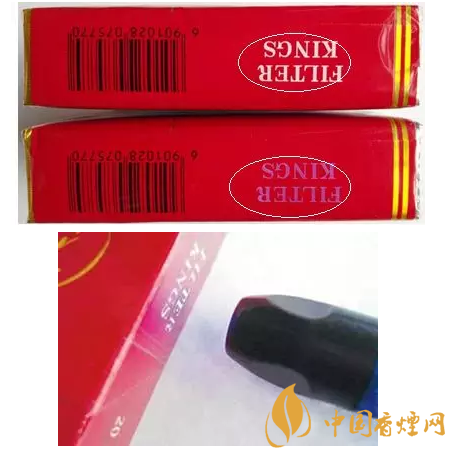 真烟“FILTER KING”字样经紫外光照射后由白色变成紫红色,停止照射后,紫红色会逐渐消退;“FILTER KING”字样经紫外光照射后不变色的为假烟。.鉴别真假“中华”时需要借助紫光灯、放大镜等检验工具。