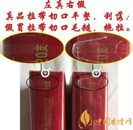 左真右假,真品的拉带切口比较平整,利落;而假冒的香烟拉带口就比较粗糙毛躁,拖拉。