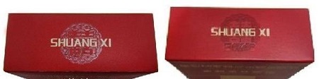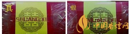 如图所示:真品商标纸颜色为深红色,正面喜字烫金边缘凸起感明显;假烟商标纸颜色多为鲜红色,正面喜字为平版印刷且边缘未见凸起感。(左真右假)