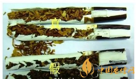 如图所示:真品烟支采用二段式生物降焦滤嘴,烟丝颜色为金黄色,切丝宽度均匀一致;假烟多采用单一的普通滤嘴,烟丝颜色多为褐色。(上真下假)