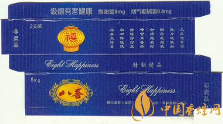“八喜”香烟高贵典雅的烟标装潢设计,曾获得第八届华东装潢设计大奖展最佳创意奖。“八喜”香烟问世后,青州卷烟厂得知人们很想知道“八喜”具体指哪“八喜”,于是该厂于1999年向社会广泛征集吉祥语,从中精选出“久旱逢甘霖、他乡遇故知、洞房花烛夜、金榜题名时、升官又晋爵、财源纷纷至、家和体魄健、尽享天伦日”等八句具有代表性的吉祥语,作为“八喜”的诠释和具体所指。