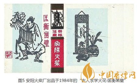 上世纪80年代,安阳火柴厂出品的“古人求学”火花,再现了部分古代学霸身处逆境、好学不倦的形象。这套火花主版为我国传统文化中的文书工具,即“文房四宝”毛笔、砚台、墨、纸,其中纸已经画成了一幅精美的山水国画,装裱后挂在墙上,以供观赏。主版则分别描绘了车胤束萤、黄霸读经、刘恕忘食、孙敬悬梁、荀淑求教、买臣负薪、郑王辞位苦读等古代十二位著名的读书典范代表。其中“匡衡凿壁”(图5)一枚,描绘了西汉匡衡凿穿墙壁引邻舍之烛光,手捧竹简苦读的形象。
