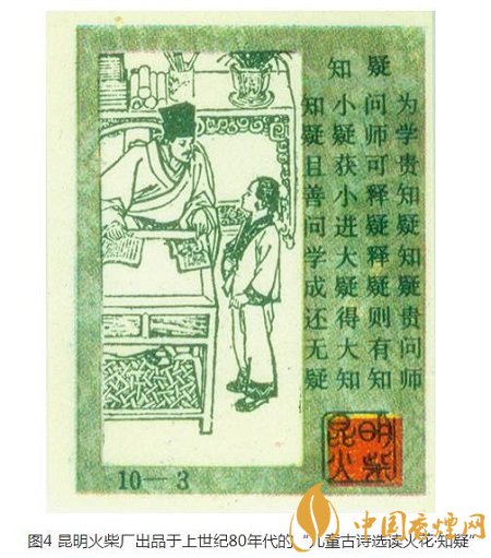 读书学习贵在求教,一有疑问马上向老师请教,以此获得更大的进步。上世纪80年代,昆明火柴厂十枚/套的“儿童古诗选读”火花中,“知疑”(图4)就定格于一名学童在向一名私塾先生提出自己的疑问后,倾听私塾先生给他讲解。画面旁边还配印有古诗“为学贵知疑,知疑贵问师。小疑获小进,大疑得大知。知疑且善问,学成还无疑”。