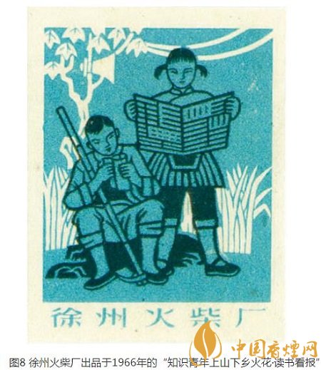 徐州火柴厂出品于同年的四枚/套的“知识青年上山下乡”火花,“读书看报”(图8)一枚再现了一对知青利用休息间隙,在田间地头读书看报补充知识的画面。