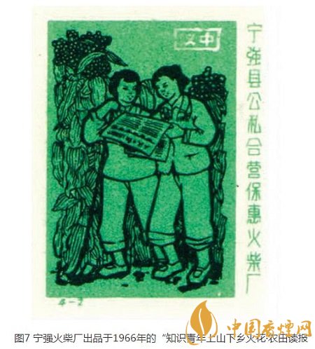 宁强火柴厂出品于同年的四枚/套的“知识青年上山下乡”火花,其中“农田读报”(图7)一枚,反映了两名下乡女知青在生长茂盛的农田地头捧读《人民日报》,藉以寻求怎样让农田获得高产的良策。