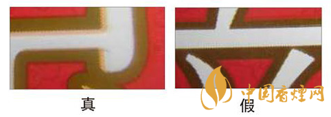看条盒商标印刷。真烟套印准确,凹印效果好,边缘图纹圆润。假烟没有凹凸效果,且边缘图纹粗糙。