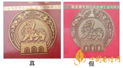 看小盒拉带。真品“南京”(红)拉带上字体清晰,光泽鲜艳,字体里有许多细小的水平纹路。假烟笔画较粗,光泽暗淡。