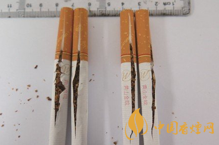 烟丝结构差异对比:真品烟丝颜色呈现出金黄色,叶丝配比多,油润性好,含烟末少,切丝宽窄均匀一致;假烟烟丝劣质,叶丝配比少,烟丝掺杂质多,烟梗大、烟末多,与真品烟丝结构存在明显差异。