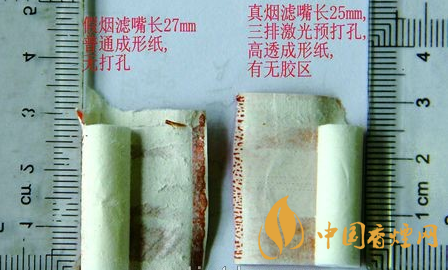 2、烟支过滤嘴不同,真品卷烟滤嘴长25mm,三排激光预打孔,高透成型纸,有无胶区;假烟滤嘴长27mm,普通成型纸,无打孔。