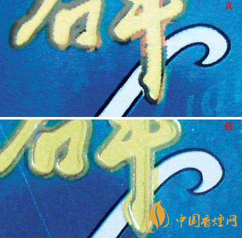 看商标纸印刷方式:真烟的商标纸印刷方式为凹印与胶印相结合,黄色笔划边缘呈锯齿状、黑色笔划边缘光滑。假烟的商标纸印刷方式皆为胶印,字体笔划边缘都光滑。