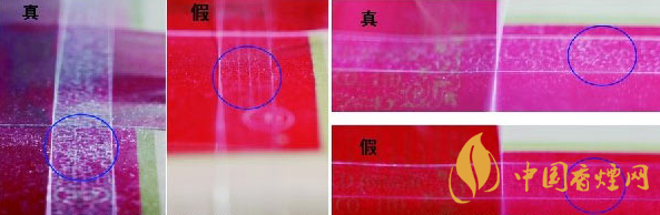 如图所示:“苏烟”的拉线采用特殊的工艺,真烟的拉线上面有很明显的“麻点”,我们通常叫做“气泡”;假烟的拉线上面没有“气泡”。