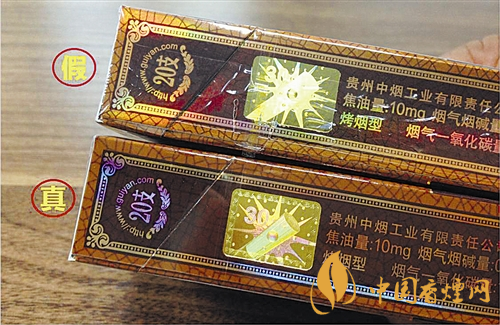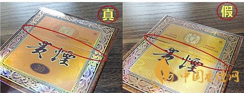 假冒:非常粗糙,方向错位,位于烟盒的左侧。
